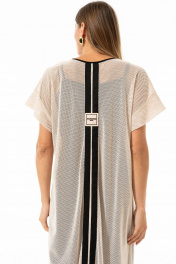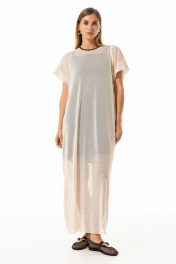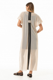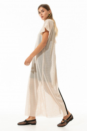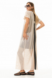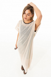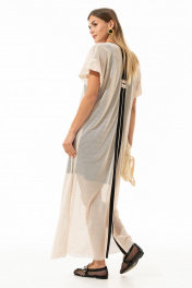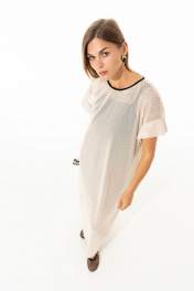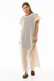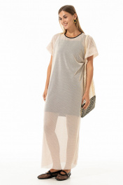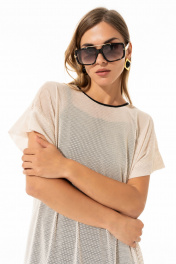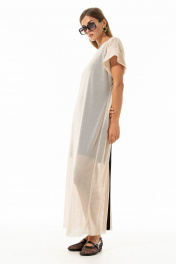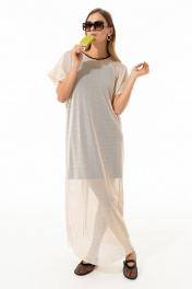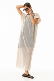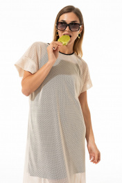 Платье, состоящее из верхнего и нижнего. Верхнее платье из сетки прямого силуэта свободного кроя со спущенной линией плеча с маленьким рукавом, с округлым вырезом горловины, по спинке-разрез, декорирован отделочной тесьмой и нашивкой. Нижнее платье-комбинация из вискозы прямого силуэта расширенное к низу на бретелях. Нижнее платье-комбинация-это полноценное платье из 100% вискозы, которое можно носить без верхнего, дополнив трендовыми украшениями. дл.платья из сетки-140 см, длина нижнего платья