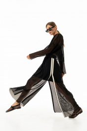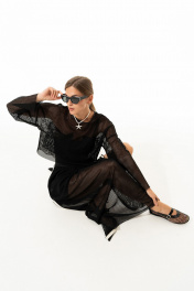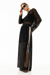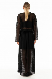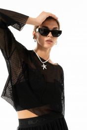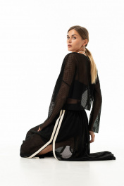 Лонгслив из сетки в крупную ячейку прямого силуэта свободного кроя со спущенной линией плеча, с округлым вырезом горловины, накладными карманами по переду. Низ изделия,края рукавов с необработанным краем. !Внимание!(на модели топ в комплектацию к изделию не входит)! длина юбки по боковому шву с резинкой -98 см