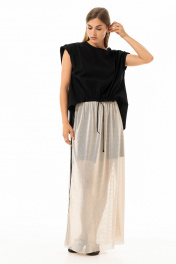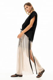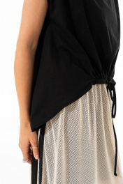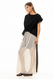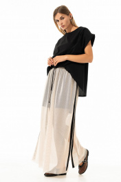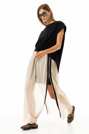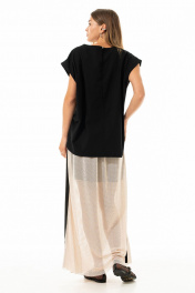 Блузка прямого силуэта свободного кроя с фигурным низом(спинка длиннее переда),округлой горловиной,спущенной линией плеч,по плечам-складки,по переду низа изделия-резинка со шнурком.Спинка с застёжкой на навесную петлю и пуговицу. длина блузки - 67см