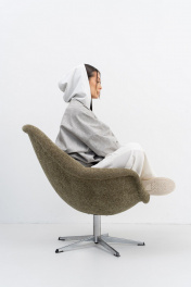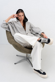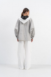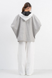 Куртка из хлопка с эффектом потёртости,необычной формы актуального кроя со спущенной линией плеча,застёжка на пети и пуговицы,рукава на манжетах.Капюшон с петлями из двух видов ткани делает образ законченным,его можно отстегнуть от основного изделия. Свободный крой не сковывает движения,он прекрасно подойдёт для расслабленного повседневного образ,а в дополнении с топом,кроссовками,бейсболкой,получится casual look на каждый день. РАЗМЕРЫ 46 48 50 52 Куртка Ширина по низу изделия,см 127 129 131 133 Длина изделия, см. (по спинке) 72 72 72 72 Длина рукава от точки плеча, см. 62 62 62 62 Ширина рукава по низу, см. 22 24 26 28