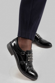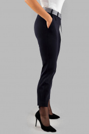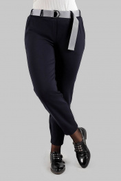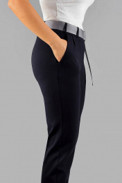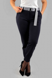 Брюки женские, зауженные к низу, с имитацией застежки по среднему шву. Передние половинки брюк с 1 складкой от пояса и карманы с отрезным бочком. Широкий 5-ти сантиметровый притачной пояс с эластичной тесьмой, гарантирует идеальную посадку на любую фигуру. По низу брюк спереди и сзади застрочены по 4 вытачки. Дополнение к брюкам - широкий съемный пояс контрастного цвета. Длина брюк по боку - 94 см.