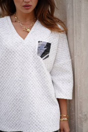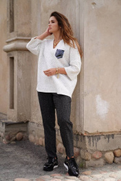 Джемпер из трикотажного полотна, свободного силуэта. Вырез горловины V-образной формы, оформлен планкой. По переду джемпера аппликация кармана. Спинка со средним швом. Рукав втачной длиной 3/4, со спущенным плечевым срезом. Длина изделия: 68 см Длина рукава от горловины: 61 см