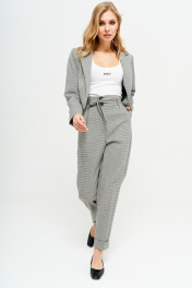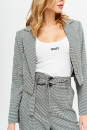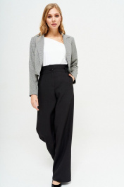 Ультрамодный укороченный жакет из костюмно-плательной ткани, полуприлегающего силуэта, на подкладке, без застежки. Воротник пиджачного типа. Перед с талиевыми вытачками. Спинка с рельефами и средним швом. Рукав втачной двушовный длинный. Длина изделия: 40 см Длина рукава: 61 см