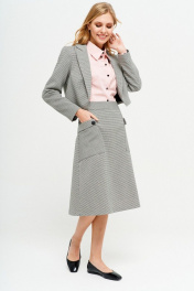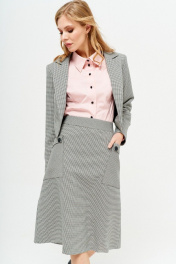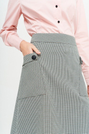 Лаконичная юбка из костюмно-плательной ткани, расширенная книзу, на подкладке, на широком притачном поясе. На переднем полотнище настрочены большие накладные карманы с отворотом и декоративной пуговицей. Застежка на молнию с боковом шве. Длина изделия: 69 см