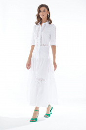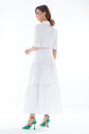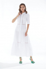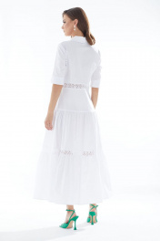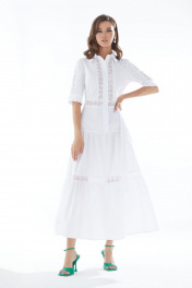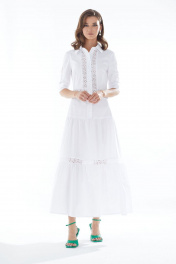 Платье полуприлегающего силуэта, расширенное книзу. Воротник рубашечного типа на притачной стойке. Перед с центральной застежкой на петли и пуговицы. По переду и спинке - талиевые вытачки. Платье по низу с двумя широкими воланами со сборкой. Рукав втачной короткий с притачной манжетой. Платье декорировано подрезами из ришелье по талии, рукаву, планке и волану. Длина изделия: 134 см Длина рукава: 33 см
