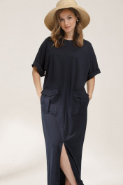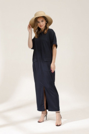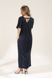 Элегантное платье О-образного силуэта. Горловина овальной формы, с V-образным вырезом и декоративными завязками по спинке. Перед с центральным швом и разрезом внизу, и накладными карманами с клапаном и боковым входом. Рукав цельнокроеный короткий, со спущенным плечевым срезом с притачной манжетой. Длина изделия: 136 см Длина рукава: 37 см
