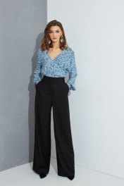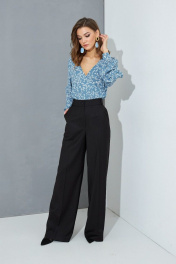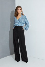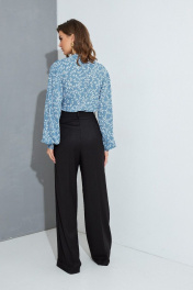 Стильные широкие от бедра брюки прямого силуэта с высокой талией. По верху брюк притачной пояс с застежкой на петли и пуговицы и шлевками для пояса. На передних половинках обработаны наклонные карманы и застежка молния в среднем шве. Передние и задние половинки с вытачками и кантом. По переду на шлевке - декоративное украшение. Длина брюк: 113 см