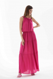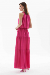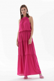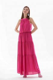Эффектное летнее платье свободного силуэта, без рукава. Горловина оформлена притачной планкой с застежкой на петли и пуговицы по спинке. Платье отрезное по линии талии на резинке. Лиф платья с английской проймой. Нижняя часть с тремя широкими воланами со сборкой. Рост 164-170. Длина изделия: 150см