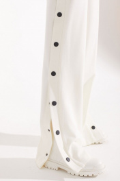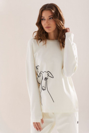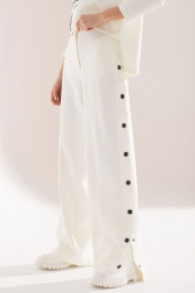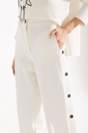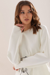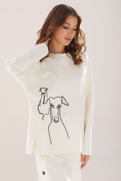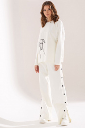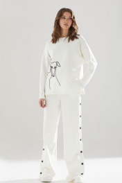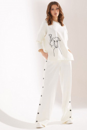Комплект-двойка, состоящий из джемпера и брюк. Стильный джемпер прямого силуэта из трикотажа с фигурным низом и разрезами. Горловина округлая. Рукав со спущенной линией плеча удлиненный, в шве рукава, по низу, прорезь. По переду джемпер декорирован дизайнерской печатью. Стильные брюки прямого силуэта из трикотажа. По верху брюк притачной пояс с застежкой на кнопку. На передних половинках обработаны наклонные карманы и застежка молния в среднем шве. В боковых швах с обеих сторон декоративная планка с пуговицами, по низу разрезы. Длина джемпера: (44-48р - 59см),(50-54р - 62см),(656-60р – 65см) Длина рукава от горловины: 74см Длина брюк: (44-48р - 110см),(50-54р – 111см),(56-60р – 112см)