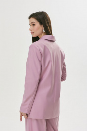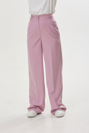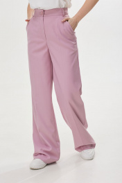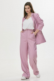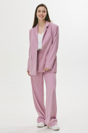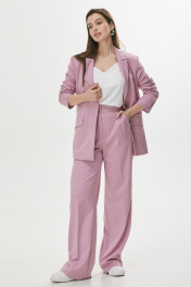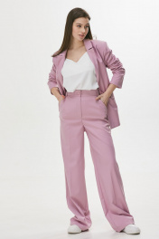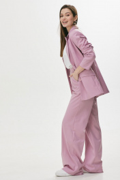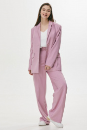 Жакет женский, однобортный, прямого силуэта из костюмной ткани. Застежка на петли и пуговицы. Перед с функциональными прорезными карманами с листочкой и клапанами. Перед с отрезным бочком. Спинка со средним швом. Рукав двухшовный, втачной, длинный. Воротник отложной пиджачного типа. Жакет на хлопковой подкладке. Широкие от бедра брюки прямого силуэта с высокой талией из костюмной ткани. По верху брюк притачной пояс с застежкой на петлю и пуговицу и шлевками для ремня. На передних половинках обработаны наклонные карманы и застежка молния в среднем шве. Задние и передние половинки с кантом, На задних половинках вытачки. С 50-60р в брюки на поясе вставлена эластичная тесьма (резинка). Обращаем ваше внимание, что фурнитура может незначительно отличаться от фото. Длина жакета: (44-48р - 72см)(50-54р - 75 см)(56-60р – 78 см) Длина рукава: 60 см Длина брюк: 113 см