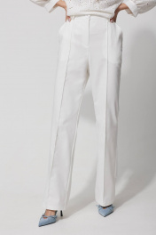 Брюки слегка зауженные на уровне колена и расширенные книзу из костюмной ткани с добавлением хлопка. По верху брюк притачной пояс с застежкой на петлю и пуговицу и шлевками для ремня. На передних половинках обработаны наклонные карманы и застежка молния в среднем шве. По цетру передних половинок декоративный защип. На спинке вытачки и декоративный элемент. С 50 по 60 размер в брюки на поясе вставлена эластичная тесьма (резинка). Обращаем ваше внимание, что фурнитура может незначительно отличаться от фото.
