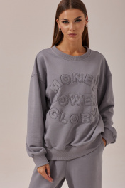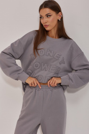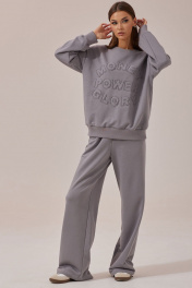 Стильный костюм состоящий из джемпера и брюк. Джемпер прямого силуэта с притачный поясом по низу из трикотажного полотна. Горловина округлая с притачной планкой. Джемпер со спущенным плечом, рукав одношовный втачной с притачным манжетом по низу. Брюки прямого силуэта из трикотажного полотна. По верху брюк притачной пояс с резинкой по кругу и наклонными карманами по переду. Длина джемпера: (44-48р - 63см)(50-54р - 65см)(56-60р - 67см) Длина рукава от горловины: (44-48р - 75см)(50-54р – 76см)(56-60р - 77см) Длина брюк: 109см +пояс 5см.