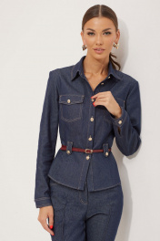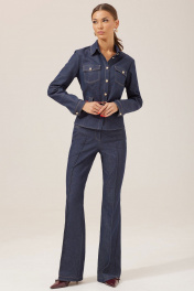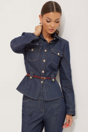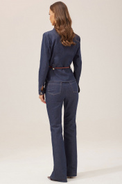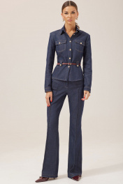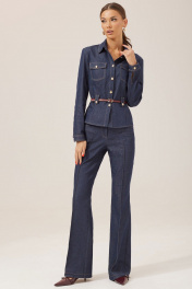 Стильный костюм состоящий из жакета и брюк. Жакет полуприлегающего силуэта из джинсовой ткани. Воротник стояче-отложной на отрезной стойке, по центру застежка на петли и пуговицы. Рукав втачной, по низу манжета с застежкой на петли и пуговицы. По переду накладные карманы с клапанами и пуговицами, на уровне линии талии паты с декоративными пуговицами. По переду и спинке талиевые вытачки. В комплект входит ремень. Обращаем ваше внимание, что фурнитура может незначительно отличаться от фото. Брюки прилегающего силуэта расширенные книзу из джинсовой ткани. По верху брюк фигурный пояс с застежкой на петлю и пуговицу. По переду и спинке отрезные кокетки. На передних половинках обработаны наклонные карманы, застежка молния в среднем шве и декоративные защипы. На спинке накладные карманы. Обращаем ваше внимание, что фурнитура может незначительно отличаться от фото. Длина жакета (44-48р - 56см)(50-54р - 58см) Длина рукава 62см Длина брюк (44-48р - 112см+пояс 4см)(50-54р - 113см+пояс 4см )