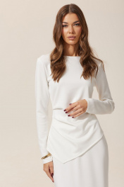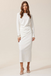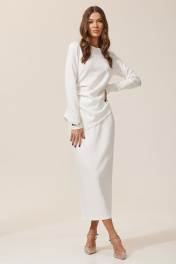 Элегантный трикотажный комплект, состоящий из джемпера и юбки длины макси. Юбка прилегающего силуэта, зауженная к низу. По верху изделия притачной пояс на эластичной тесьме (резинке). Юбка на подкладке, сзади расположен разрез. Джемпер с ассиметричным низом и декоративными складками на уровне талии. Длина юбки 87 см + пояс 4 см . Длина джемпера 62 см . Длина рукава 62 см .