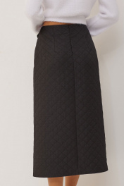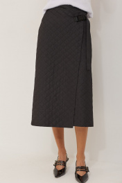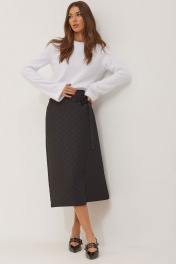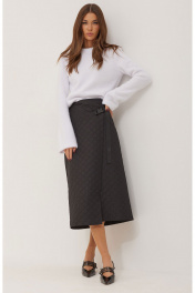Юбка А- силуэта из плательно-костюмной ткани с эффектом стежки. По переду отлетная деталь в виде запаха с декоративной пряжкой. На спинке по центру потайная молния и талиевые вытачки. Юбка без подкладки. Обращаем ваше внимание, что фурнитура может незначительно отличаться от фото. Длина юбки 78 см.