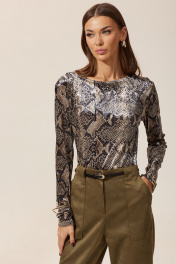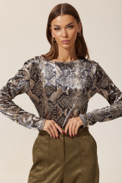 Лонгслив полуприлегающего силуэта из трикотажного полотна с трендовым принтом. Горловина –лодочка. Рукав втачной удлиненный. Длина джемпера (44-48р – 59 см)(50-54р – 62 см). Длина рукава 65 см .