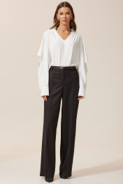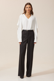 Брюки прямого силуэта из костюмной ткани. По верху брюк притачной пояс с застежкой на петлю и пуговицу и шлевками для ремня. На передних половинках обработаны карманы и застежка молния в среднем шве. На задних половинках вытачки. Ремень в комплект не входит. Длина брюк (44-48р – 109 см+пояс 4 см) (50-54р – 110 см+пояс 4 см)(56-60р – 111 см+пояс 4 см)