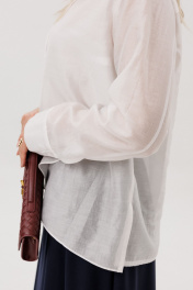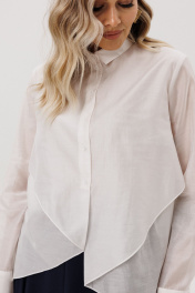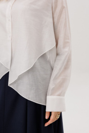 Рубашка прямого силуэта с воротнико на стойке и втачным рукавом с манжетами. Полочка двойная с ассиметричной линией низа.