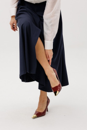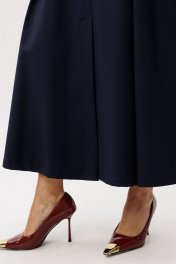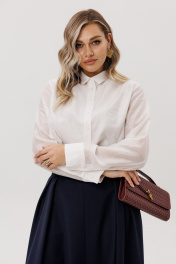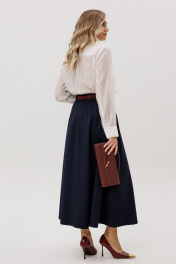 Комплект двухпредметный , сотоит из рубашки и юбки. Рубашка прямого силуэта с воротником на стойке и втачным рукавом с манжетами. Полочка двойная с ассиметричной линией низа. Юбка расклешенная на подкладке. По предней половинке по линии талии складки. По среднему шву передней половинки шлица. В боковых швах карманы. По среднему шву задней половинки по линии талии застежка на потайную тесьму-молнию.Ширина по линии талии регулируется резинкой