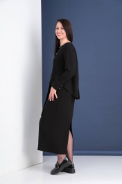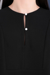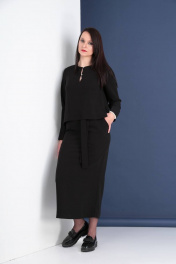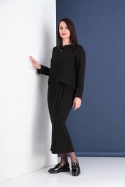 Комплект состоит из двух предметов. Юбка прямого силуэта со средним швом по заднему полотнищу, заканчивающимся разрезом. Застежка на потайную молнию. Карманы в отрезном бочке переднего полотнища. Длину притачного пояса регулирует резинка. Юбка дополнена завязывающимся поясом, продета в шлевки. Блуза прямого,свободного силуэта с удлиненной спинкой. На спинке заложены складки от кокетки. Полочка укорочена, в нижне части швов притачивания бочков обработаны шлицы от уровня линии талии. Декоративная вставка в верхней передней части со швом и застежкой на две навесные петли и пуговицы контрастного цвета. Рукав втачной с локтевым швом и широкой притачной манжетой, застегивающийся на две навесные петли и пуговицы.