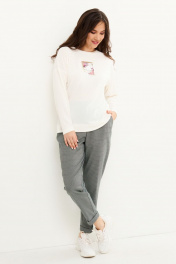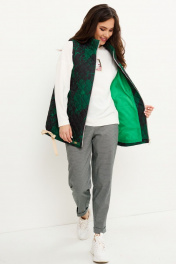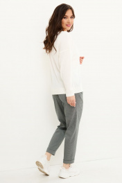 Стильный комплект из утепленного жилета, блузы и брюк. Жилет прямого кроя, на подкладке с центральной застежкой на тесьму-молнию. Дополнен боковыми карманами. По низу жилета кулиска с тесьмой. Блуза свободного кроя. Рукав втачной, слегка спущен. Выполнена из трикотажного полотна. По груди дополнена термо-аппликацией. Брюки свободного кроя, слегка заужены к низу, с притачным поясом. Пояс дополнен эластичной тесьмой. Посадка средняя. Брюки дополнены боковыми карманами. Застежка на пуговицу и молнию. Выполнены из костюмной ткани. Длина жилета от плечевого шва 75см. Длина блузы от плечевого шва 66см. Длина рукава 57. Длина брюк 95см.