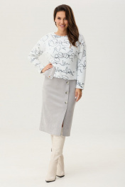 Элегантное платье свободного кроя. Выполнено как имитация блузы и юбки. Верх платья отлетной, выполнен из трикотажного полотна альпака. По спинке застежка на металлическую молнию. Низ платья выполнен из текстильной замши. Платье дополнено накладным карманом с пришивным украшением. Длина от плечевого шва 119 см. Длина рукава 57 см.