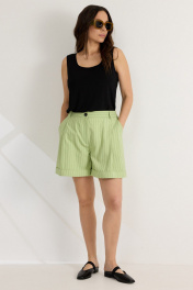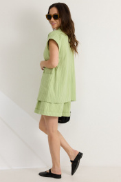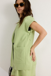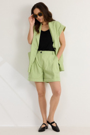 Стильный и лаконичный комплект из жилета и шорт. Выполнен из поливискозного полотна цвета лайм в меловую полоску. Удлиненный однобортный жилет свободного кроя со спущенной линией плеча. Жилет без подкладки. Горловина обработана отложным воротником. Застежка на пришивную пуговицу. Жилет дополнен функциональными боковыми карманами. Шорты свободного кроя с притачным поясом, дополненным эластичной тесьмой. Застежка гульфик на молнию и пуговицу. Шорты дополнены шлевками для ремня и удобными боковыми карманами. Низ шорт с подворотом. Длина жилета от плечевого шва 74см. Длина шорт по боковому шву 45см.