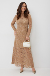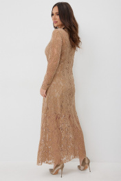 Элегантное и стильное платье макси из нежного бархатного кружева. Платье прилегающего силуэта с легким клешением книзу. Платье дополнено нижней комбинацией на тонких бретелях, выполненной из приятной к телу ткани в цвет кружева. Рукав втачной, дополнен притачным, слегка расклешенной кружевной манжетой с открытым срезом. Спереди плате с фигурным подрезом. Горловина обработана стойкой. Низ платья с открытым срезом. Длина платья от плечевого шва 146см. Длина рукава 169см.