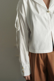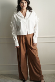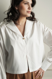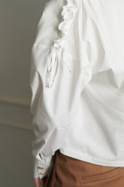 Блузка прямого силуэта, короткая, с цельнокроенным рукавом. Воротник костюмного типа. По плечевому шву кулиска и по две рюши. Перед с центральным швом с разрезом по низу. Рукав с манжетой. По линии проймы отрезной, образуя спущенную линию плеча. По шву притачивания рукава к манжету сборка. Манжет застегивается на 2 кнопки. Длина изделия (по спинке) - 54 см.
