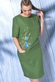 Платье льняное от MALI прямого силуэта со слегка углубленной горловиной округлой формы. Перед с нагрудными вытачками, выходящими из боковых швов. По полочке с правой стороны в области бедра настрочен накладной карман, из которого выходит вышивка. Спинка со средним швом, вверху которого выполнена застежка на потайную молнию, внизу- разрез. Рукав втачной одношовный короткий.