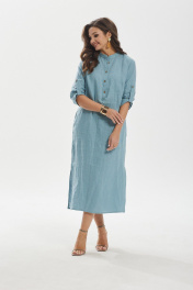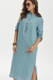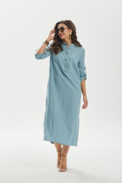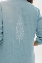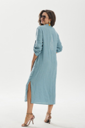 Платье прямое с разрезами по боках. В боковых швах карманы. Воротник-стойка. Застежка на планку до уровня талии с пуговицами. Рукав прямой втачной ¾ с застежкой на пату. На спине вышивка.