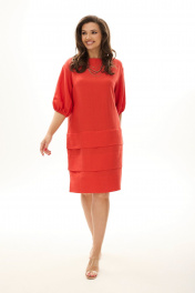 Платье прямого силуэта с крупными декоративными складками по низу юбки. В боковых швах по низу небольшие разрезы. Горловина в форме лодочки, плечо спущенное. Рукав ¾, расширенный книзу, собранный на резинку.