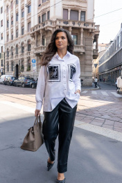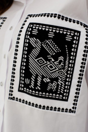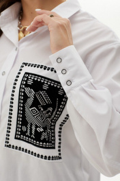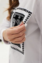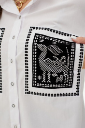 Блуза женская прямого силуэта со спущенным плечом, рубашечным рукавом с высокой манжетой. По спинке отрезная кокетка с выходящими складками. По переду нагрудные накладные карманы с принтом флоком. Вход в карман со стороны проймы. Воротник рубашечный с отрезной стойкой. Планка с застежкой на пуговицы. Низ блузки разноуровневый.