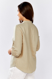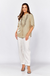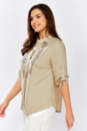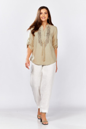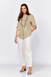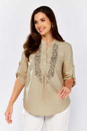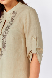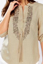 Блуза прямого силуэта.По спинке плечевые вытачки По переду нагрудные вытачки , по центру планка с застёжкой на петли и пуговицы.Вдоль планки одноцветная вышивка. Низ фигурный с разрезами в боковых швах.Воротник-стойка. Плечо слегка спущено. Рукав рубашечного покроя, 3/4 с застёжкой на пату и пуговицу