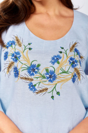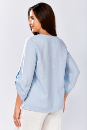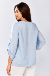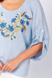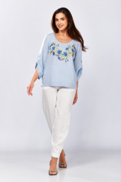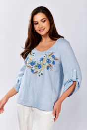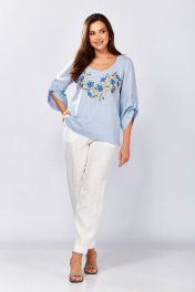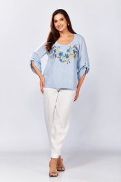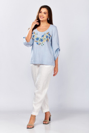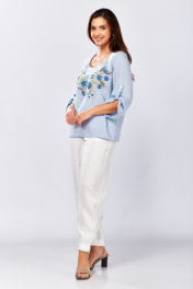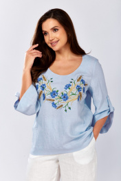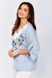 Блузка прямого силуэта. По переду нагрудные вытачки и декоративная вышивка. Горловина округлой формы. В боковых швах разрезы. Рукав втачной, расширен к низу, с застёжкой на пату и пуговицу.