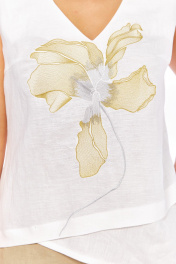 Блуза прямого силуэта. По переду нагрудные вытачки от боковых швов, декоративная вышивка. Низ ассиметричный с отрезной деталью. разрез в левом боковом шве. Плечо слегка спущено. Горловина с V- образным вырезом .
