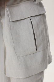 Комплект женский, состоящий из жакета и брюк. Жакет полуприлегающего силуэта, рукав длинный втачной, спинка со средним швом. По переду накладные карманы со складкой и клапаном. Пояс в комплекте. Брюки прямые на резинке по спинке, по переду рельефы, на задней половине вытачки. Застежка на молнию и пуговицы.