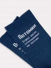 Носки мужские классические с высоким бортом и с рисунком в виде надписи "Потомки (сущ) дела, отложенные на потом" — оригинальный и удобный вариант для ежедневной носки. Выполнены из гребенного хлопка - пряжи высочайшего качества, мягкой, тонкой, но прочной. Натуральные волокна отлично пропускают воздух, позволяя коже дышать, и впитывают влагу, дарят ощущение комфорта в течение всего дня. Благодаря небольшому количеству эластана в составе, длинные носки хорошо облегают стопу и сохраняют форму даже после множества стирок. Мягкая эластичная резинка надежно удерживает носки на ноге, но не давит. Пятка и мысок дополнительно усилены, что гарантирует защиту от протирания и повышенную износостойкость — мужские носки с принтом прослужат долго. Отличный выбор на каждый день. Рекомендуем!
