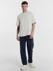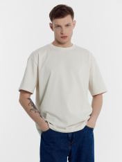 Футболка изготовлена из трикотажного полотна кулирки.Футболка прямого силуэта, оверсайз. Длиной до линии бедер. Рукава втачные короткие 2х шовные. Плечо спущено. Горловина округлой формы. Обработана обтачкой из рибаны. Шов втачивания обтачки по спинке закрыт бейкой из основного полотна. По спинке отрезная кокетка. Нижний срез футболки и рукавов обработан швом вподгибку на 2х игольной плоскошовной машине. Нижний срез спинки фигурный.