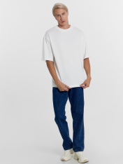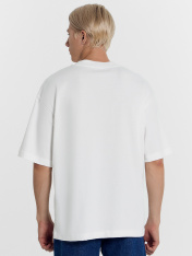 Футболка изготовлена из трикотажного полотна кулирка. Футболка свободная, оверсайз.Горловина округлой формы обработана обтачкой из рибаны. Шов втачивания обтачки по спинке закрыт тесьмой хб. Рукава втачные, корткие. Линия плеча спущена. Нижние срезы футболки и рукавов обработаны швом вподгибку.