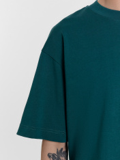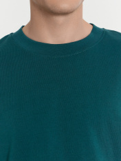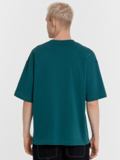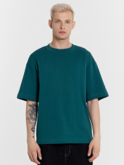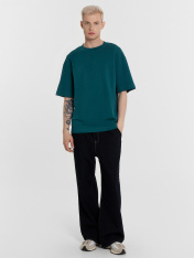 Футболка изготовлена из трикотажного полотна кулирка._x000D_ Футболка свободная, оверсайз.Горловина округлой формы обработана обтачкой из рибаны. Шов втачивания обтачки по спинке закрыт тесьмой хб._x000D_ Рукава втачные, корткие. Линия плеча спущена._x000D_ Нижние срезы футболки и рукавов обработаны швом вподгибку._x000D_
