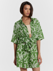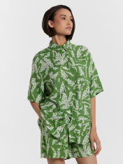 Эта женская рубашка — идеальное воплощение комфорта и стильного минимализма, созданное для расслабленных и элегантных образов. Свободный крой дарит легкость и непринужденность, позволяя чувствовать себя комфортно в течение всего дня. Модель выполнена из вискозы — натурального волокна, которое известно своей мягкостью и отличной воздухопроницаемостью. Оно приятно ощущается на коже, обеспечивая максимальный комфорт даже в жаркую погоду. Кроме того, вискоза отличается высокой прочностью и устойчивостью к износу, что делает рубашку долговечной и практичной. Классический рубашечный воротник и центральная застёжка на пуговицы подчеркивают строгую элегантность, а накладной карман слева на груди добавляет функциональности. Короткие рукава со спущенной линией плеча делают модель еще более расслабленной и удобной в движении, создавая стильный акцент. Эта рубашка станет универсальным элементом вашего гардероба, идеально сочетающимся с шортами, брюками или юбками. Завершите образ подходящими шортами из той же коллекции для создания гармоничного и легкого комплекта!