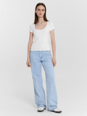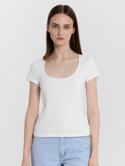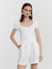 Женская футболка прилегающего силуэта — идеальный вариант для тех, кто ценит комфорт и элегантность. Глубокая овальная горловина подчеркивает изящность, а эластичная тесьма по краю выреза обеспечивает удобную посадку и сохраняет форму даже после множества стирок. Короткие рукава делают модель универсальной, подходящей для повседневной носки. Эластичный хлопок дарит мягкость, хорошо тянется и обеспечивает свободу движений. Этот материал отличается высокой воздухопроницаемостью, позволяя коже дышать, и устойчивостью к износу, что делает футболку долговечной. Дополните футболку подходящими брюками из коллекции Mark Formelle, чтобы создать лаконичный и стильный комплект на каждый день._x000D_
