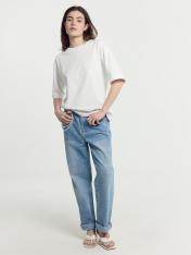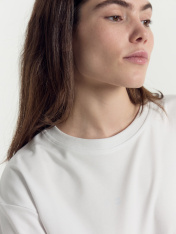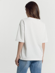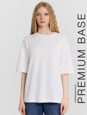 Футболка женская свободного силуэта из трикотажного полотна интерлок._x000D_ Горловина круглой формы, обтачка горловины из рибаны, шов горловины спинки_x000D_ закрыт бейкой из основного полотна. Плечо спущено, пройма углублена. Рукав втачной, длиной по локоть. Подгибки низа футболки и рукавов широкие.