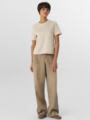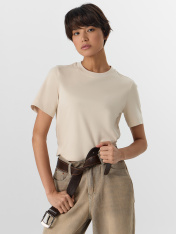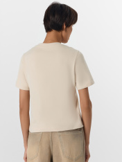 Футболка прямого силуэта из трикотажного полотна интерлок._x000D_ Горловина круглой формы, широкая обтачка из рибаны. Шов горловину спинки окантован бейкой из основного полотна._x000D_ Рукав втачной, широкий. Футболка слегка укорочена._x000D_ Подгибки низа и рукава широкие._x000D_