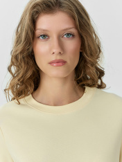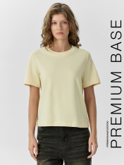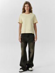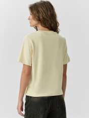 Футболка прямого силуэта из трикотажного полотна интерлок._x000D_ Горловина круглой формы, широкая обтачка из рибаны. Шов горловину спинки окантован бейкой из основного полотна._x000D_ Рукав втачной, широкий. Футболка слегка укорочена._x000D_ Подгибки низа и рукава широкие._x000D_