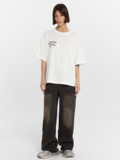 Футболка изготовлена из трикотажного полотна кулирка._x000D_ Футболка свободная, оверсайз._x000D_ Горловина округлой формы обработана обтачкой из рибаны. Шов втачивания обтачки по спинке закрыт тесьмой хб 10мм.Рукава втачные, корткие. Линия плеча спущена._x000D_ Нижние срезы футболки и рукавов обработаны швом вподгибку._x000D_ _x000D_ _x000D_ _x000D_