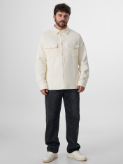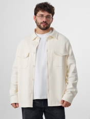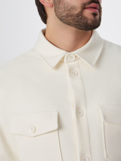 Жакет мужской из трикотажного полотна интерлок (диагональ)._x000D_ Жакет свободного прямого силуэта. _x000D_ Вырез горловины круглый с рубашечным воротником. _x000D_ Центральная застежка на пуговицы (d=20 мм). На деталях переда накладные карманы с клапанами, с застежкой на пуговицы. Линия плеча слегка спущена. Рукава втачные длинные. Манжеты отрезные с застежкой на пуговицу.Отделочные строчки по окату рукава, плечевым швам. Нижний срез жакета обработан швом вподгибку.
