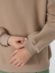 Свитшот свободного силуэта. Рукава длинные, втачные. Линия плеча спущена. Перед и спинка цельнокроенные. Горловина круглой формы обработана обтачкой из рибаны. По низу рукавов и джемпера притачены манжеты и пояс из рибаны.