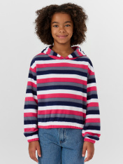 Укороченное худи от Mark Formelle — это гармоничное сочетание современного дизайна и функциональности, созданное для активных и стильных девочек. Модель выполнена из мягкого, приятного на ощупь флиса, который надежно сохраняет тепло, оставаясь легким и комфортным в носке. Свободный крой с заниженной проймой дарит полную свободу движений, а капюшон и круглая горловина добавляют практичности и защищают от ветра в прохладную погоду. Удлиненные рукава с эластичной тесьмой по краям надежно фиксируются, не сдавливая кожу, создавая аккуратный силуэт. Эластичная отделка по нижнему краю дополнительно подчеркивает спортивный стиль, при этом мягко облегая фигуру и предотвращая задирание ткани во время активных движений. Это худи легко комбинируется сджинсами, спортивными брюками или леггинсами, создавая универсальный образ на каждый день — для прогулки, школы, отдыха или тренировки. Стильная, уютная и практичная вещь, которая обязательно станет любимой частью гардероба девочки.